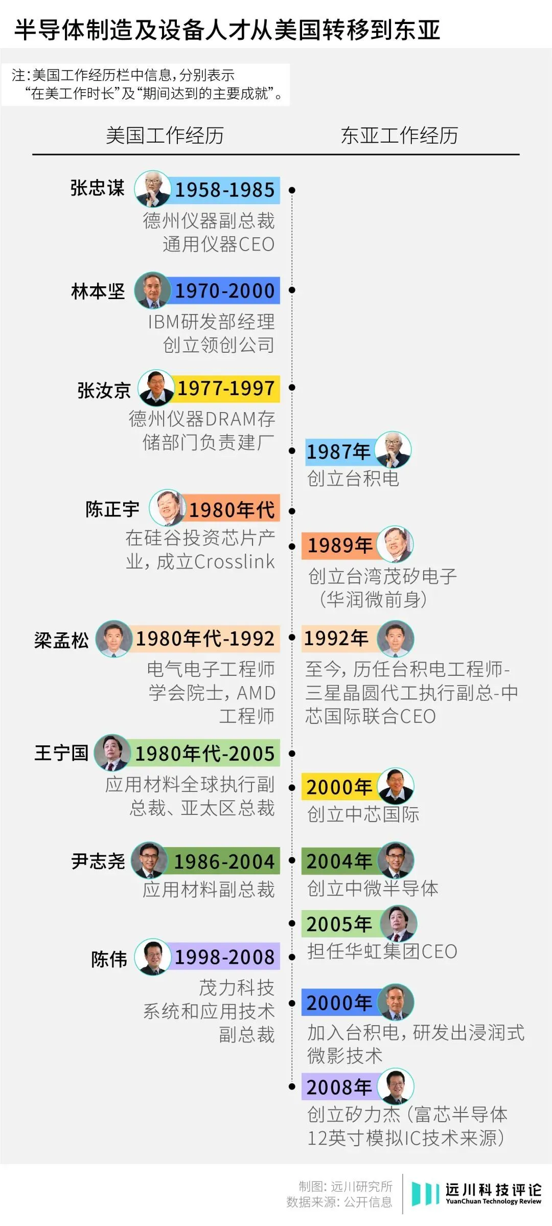 事实也是如此,美国芯片制造产业的建立来自许多亚洲面孔,他们大多都有赴美求学-在美国半导体公司工作-回亚洲创业的履历。在这个过程中,芯片制造的产线、研发和人才体系的中心也转移到了东亚地区。