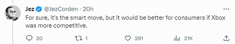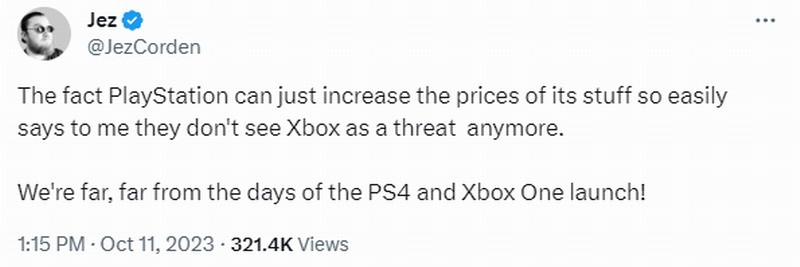 近日知名舅舅党Jez Corden发推文感慨,PlayStation肆无忌惮地涨价,是因为不再把Xbox视为威胁。他希望Xbox能提高竞争力。