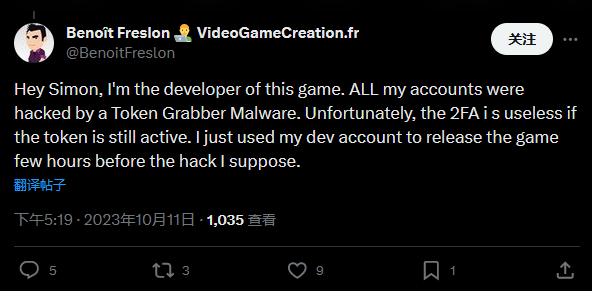 被影响的游戏之一包括《NanoWar:Cells VS Virus》。开发者 Benoit Freslon 在推特(X)上表示,他本人也是恶意软件受害者,该病毒窃取了他的浏览器上的访问令牌,使得攻击者可以访问他登陆的任何 Web 服务。他表示:“我想是在黑客攻击前几小时,我使用了我的开发账户发布了游戏。”