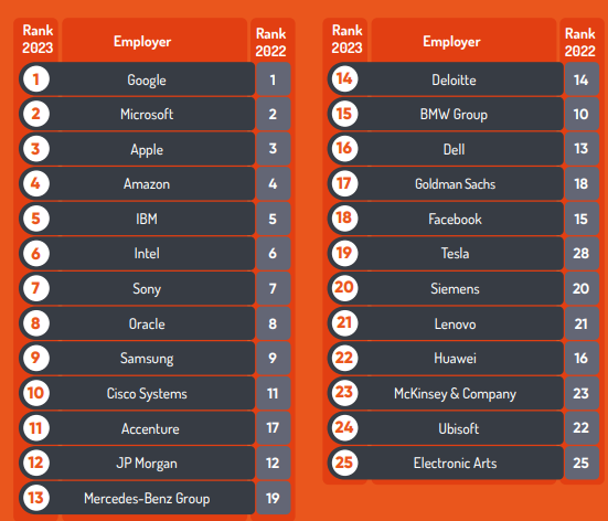 对于IT专业的学生,谷歌、微软和苹果包揽了榜单前三名。亚马逊和IBM分别是第四第五名,联想和华为则分别位列二十一和二十二名。