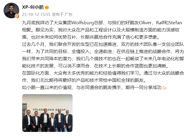 在国际化方面,大众有太多优秀的能力和经验值得我们学习。通过与大众的战略合作,我们无比期待将最好的产品和技术带给中国和全球的鹏友。如小鹏一直以来的价值观,与志同道合的鹏友携手,期待一同分享成功。