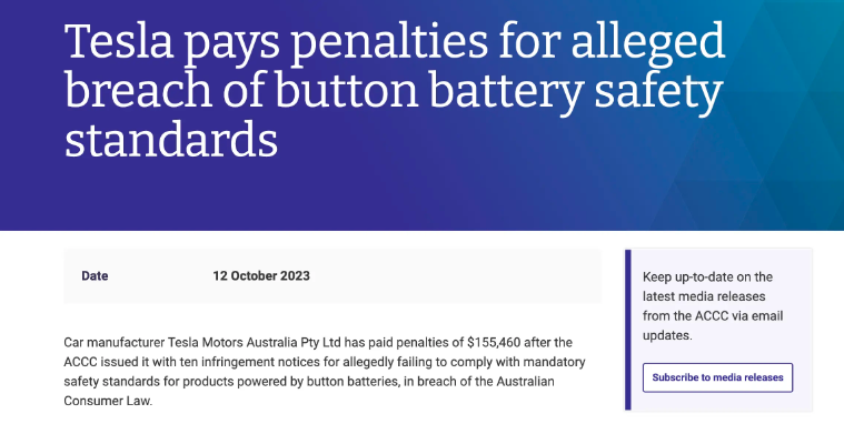 近日,据外媒报道,澳大利亚竞争与消费者委员会在其官网发布公告称:特斯拉澳大利亚公司因涉嫌未能遵守纽扣电池供电产品的强制性安全标准,违反了澳大利亚消费者法。