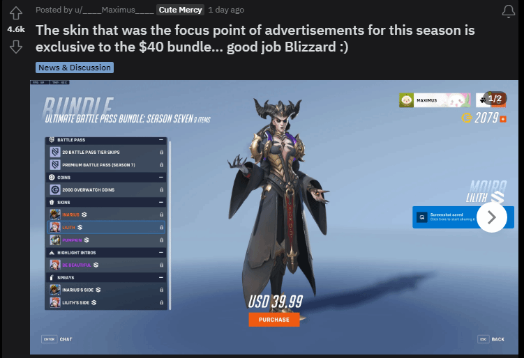 玩家普遍不满于新皮肤的获取方式,因为如果你想要获得战斗通行证和这些新皮肤,就必须支付额外的费用,其他任何方式都无法获得它们。一位国外玩家在Reddit论坛发帖声讨暴雪这一“贪婪”行为,获得了不少玩家的支持和点赞。