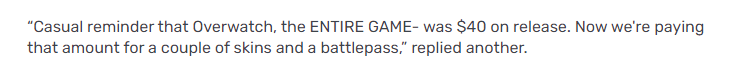 还有玩家提到,《守望先锋》整个游戏发行时的售价就为40美元。现在花同样的费用只能购买几款皮肤和一张战斗通行证。