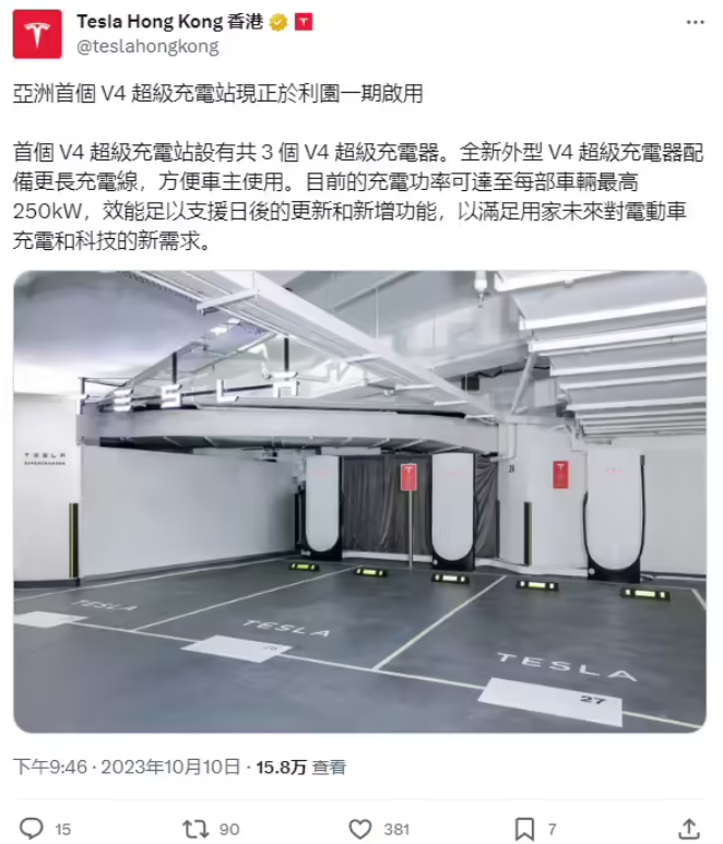 2023年,香港新注册的18,000多部电动车中有6,415部是特斯拉,可以说是香港最受欢迎的电动车品牌之一。而特斯拉官方现已确认,亚洲首个V4超充站正式在香港落地。该超充站位于铜锣湾的利园一期,现已正式启用。