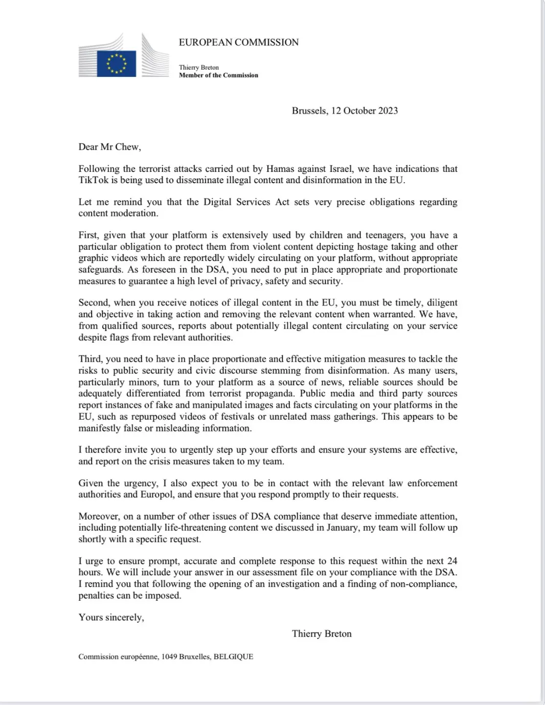 布雷顿对周受资表示,TikTok必须“及时、尽职和客观”地删除虚假信息,特别是在考虑到未成年人经常将该平台作为新闻来源的情况下。“首先,鉴于你的平台被儿童和青少年广泛使用,你承担了特别的义务,要保护他们免受人质劫持和其他暴力视频的侵害。据报道,这些内容在你的平台上广泛传播,但你们没有采取适当的保护措施。”布雷顿在信中写道。