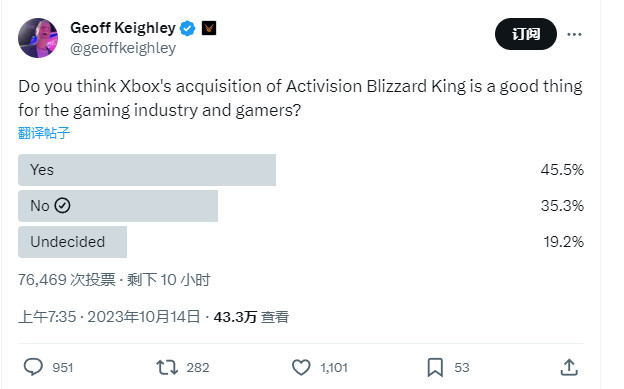 历经千难万阻后,微软在昨天正式完成了对动视暴雪的收购。这激起了国外玩家对这次天价收购案的讨论,然而根据TGA主持人Geoff Keighley最近的一次投票,相当一部分玩家是赞成态度,认为微软收购动视暴雪对游戏行业和游戏玩家有利。