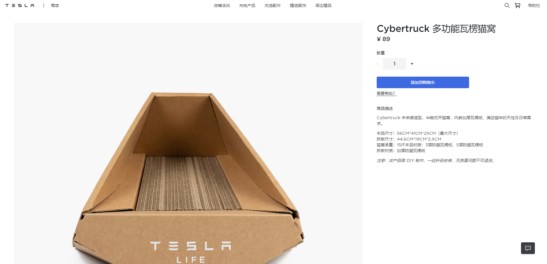 回顾特斯拉推出的周边产品,说特斯拉是周边大户一点不为过,不仅售卖特斯拉相关的帽子、保温杯、雨伞等,还推出了特斯拉钥匙带、特斯拉品鉴酒杯、CyberTruck哨子、特斯拉空玻璃酒瓶,甚至是以Cybertruck 为灵感的猫窝,售价89元。