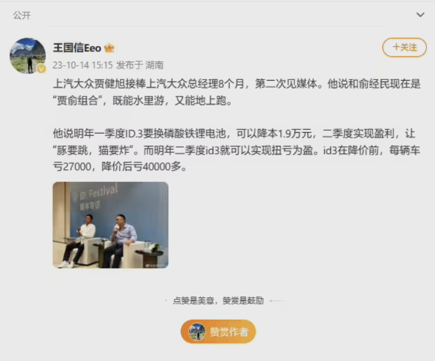 日前,有博主在微博发布消息称:上汽大众总经理贾健旭在媒体专访时透露了部分产品规划。据该博主表示:目前,大众ID.3仍处于亏损状态,降价前,每卖出一台车将亏损2.7万元,降价后每辆车的亏损超过了4万元。
