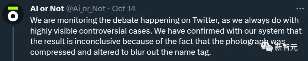 最后,AI检测器官方也针对这个事件发推,认为他们的没有办法确定图片是否由AI生成,希望大家理性讨论。
