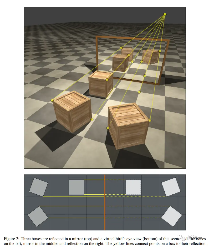 橙色线代表镜子,位于两组盒子之间的中点。黄线连接真实和虚拟盒子上的对应点。这些线彼此平行并垂直于镜子。