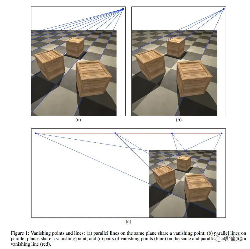 瓷砖之间的线图1(a)是平行的。成像时,这些线全部汇聚在一个消失点。如果场景中的平行线在深度上远离镜头,那么就会存在消失点,尽管它可能落在图像之外。
