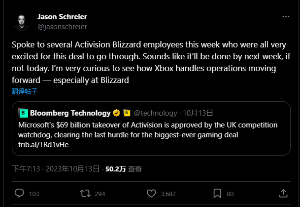 10月15日消息,外媒记者Jason Schreier周五在X平台(原推特)发文称,本周自己与动视暴雪的数名员工进行交谈,他们对这笔交易的达成“都感到非常兴奋”。