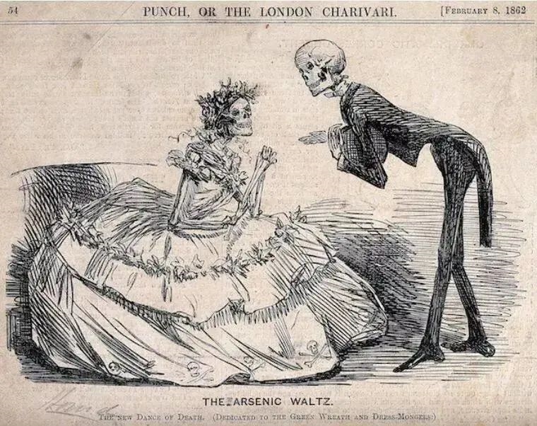 1862年刊登在英国杂志Punch上名为“砷华尔兹”的讽刺漫画,其中描绘了穿戴含砷礼服与人造花的骷髅