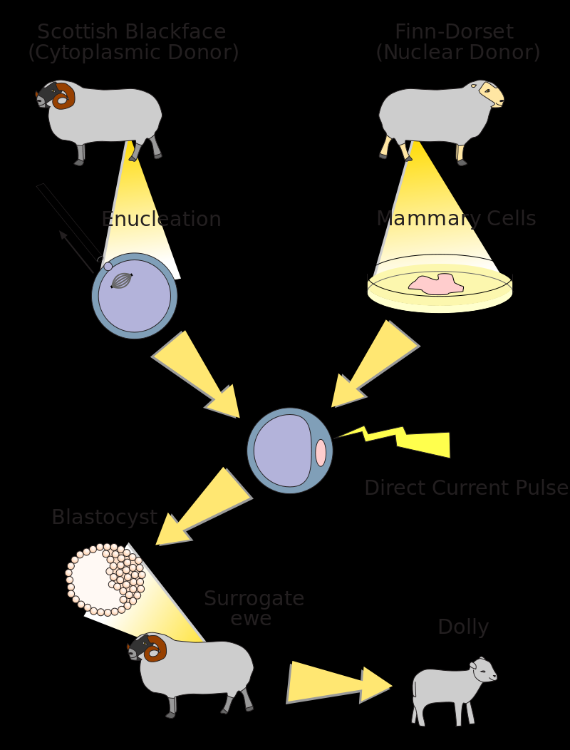 科学家们将体细胞的细胞核移植到了未受精的卵子中,并取代了卵子原有的细胞核,通过电击刺激,让卵子发育成胚囊,然后再植入母羊体内正常发育,最后分娩。