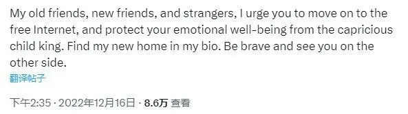 我的老朋友、新朋友和陌生人们,希望你们能转移到自由的互联网上,以保护自己的情感健康,不受任性儿童国王的伤害。在我的简历里可以找到我的新家。勇敢点,我们会在彼岸相见。