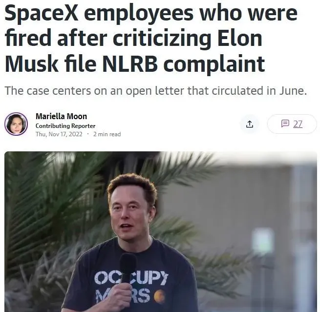 去年,SpaceX 的 9名前员工因写了一封批评马斯克的信而被非法解雇,其中八人已向NLRB提出指控。