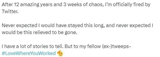 在经历了12年的美好时光和3周的混乱之后,我正式被Twitter解雇了。