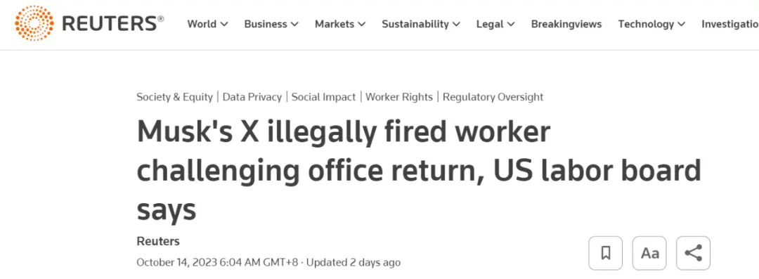 马斯克又摊上事了!10月13日(上周五),美国国家劳工委员会(NLRB) 对 X公司 (前身为Twitter )提出指控 :非法解雇公司的一名员工,只因她在Twitter上发帖质疑公司重返办公室的规定。