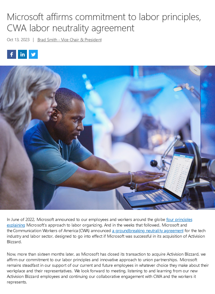 微软确认,在动视暴雪的历史性收购后,它将履行与美国通信工人协会(CWA)之间签订的劳工中立协议。微软副主席兼总裁布拉德·史密斯在微软博客上发表的一篇文章中表示:“随着微软完成收购动视暴雪的交易,我们重申我们对劳工原则和工会伙伴关系创新方法的承诺。”