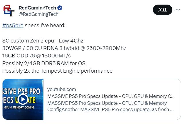 近日,外媒RedGamingTech发文爆料了他们听闻的PS5 Pro硬件规格,新主机的CPU不会有太大变化,而GPU将采用全新架构。据称,PS5 Pro将搭载8核定制Zen 2 CPU(Low 4Ghz),RDNA 3 定制GPU(60个计算单元,运行频率2500-2800MHz)、以及16GB GDDR6内存速度为18000MT/s,操作系统的内存可能是2/4GB DDR5,暴风引擎(PS5音频技术)性能则是现在的两倍,拥有两个着色器引擎,每个16WGP。