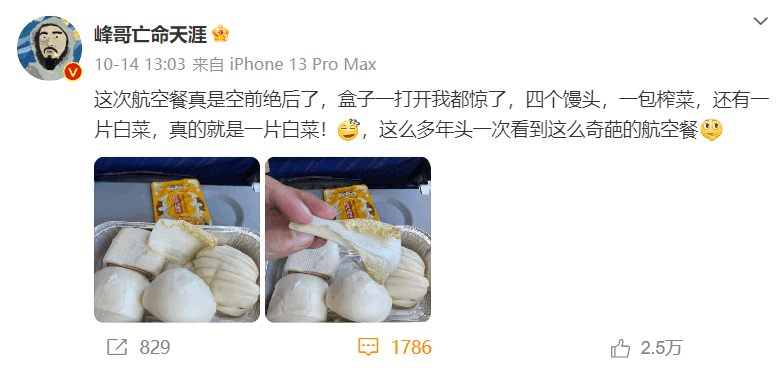 日前,网红“峰哥亡命天涯”发微博吐槽,称乘坐南航某航班时飞机餐是4个馒头和1片白菜,外加一小包榨菜,“这么多年头一次看到这么奇葩的航空餐。”此事引起网友热议,目前已有2.5万点赞,1786条评论。