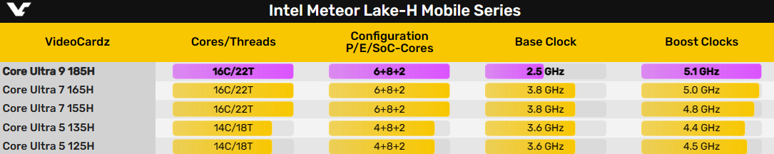 之前我们已经见过酷睿Ultra 7 165H/155H,6+8+2 16核心,主频最高5.0GHz。