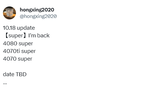 根据一直比较靠谱的曝料推友“Hongxing2020”的说法,RTX 40 SUPER系列确实在准备中,预计至少会有RTX 4080 SUPER、RTX 4070 Ti SUPER、RTX 4060 SUPER三款型号。