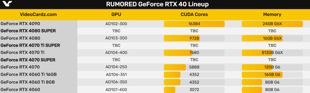 RTX 40 SUPER系列的发布时间和具体规格不详,猜测会在明年年中左右,在现有对应规格的基础上开放更多CUDA核心、显存等。