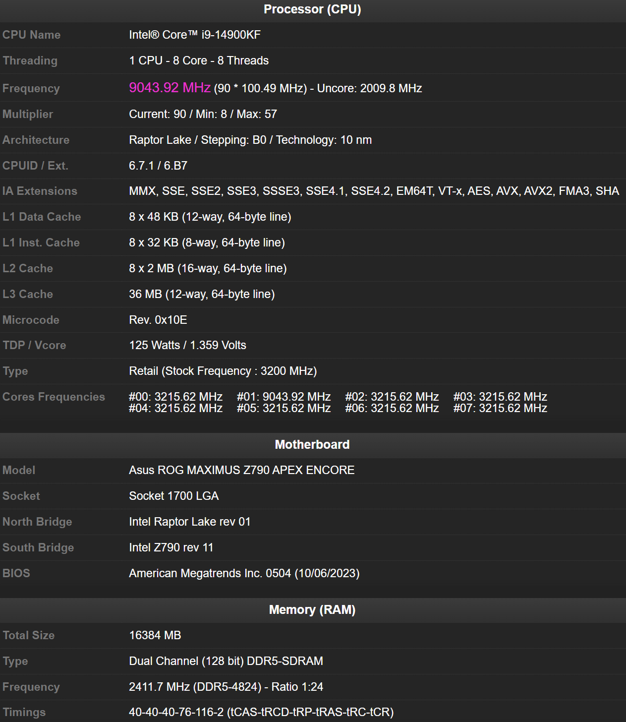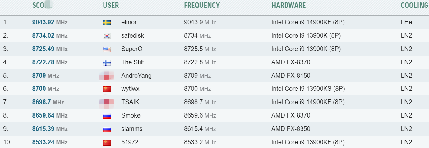 这不单是i9-14900KF的最高频率记录,也是桌面处理器的最高纪录,还是第一次突破9GHz大关,比此前i9-13900K创下的8734.02MHz提高了超过300MHz。