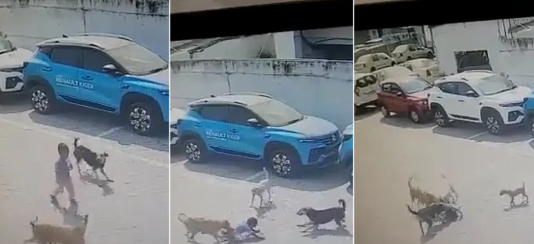 一名印度儿童在街头被流浪狗围攻。图片来源:网络