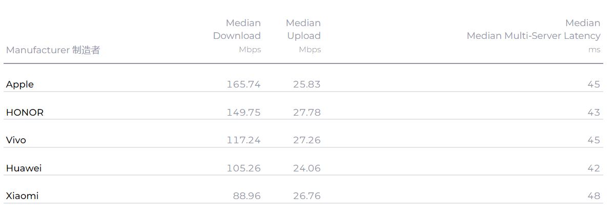 在手机厂商方面,苹果中位数下载排行继续排名第一,网速为165.74Mbps;荣耀紧随其后为149.75Mbps。