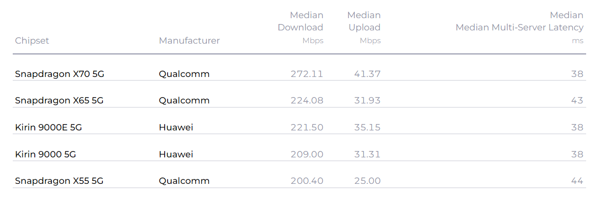 在具体芯片上,高通的骁龙X70以272.11Mbps的中位数下载速度遥遥领先,排名第二第三的分别是骁龙X65和麒麟9000E。
