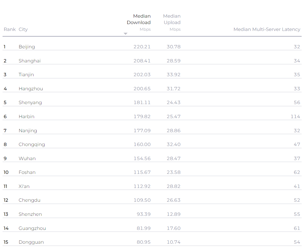 至于各个城市地区,中位数下载速度最快的城市是北京,达到了220.21Mbps,上海、天津、杭州、沈阳分列第二至第五名。