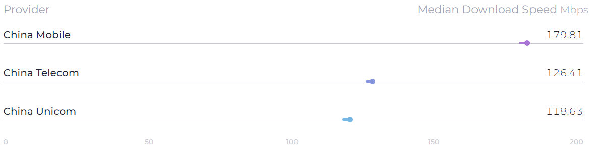 在运营商方面,中国移动以179.81Mbps的中位数下载速度排名第一,中国电信和中国联通分别以126.41Mbps和118.63Mbps位居第二和第三。