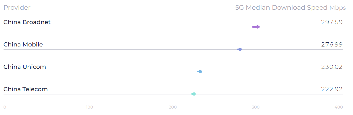 在5G网速上,中国广电以297.59Mbps的中位数下载速度位居第一,中国移动以276.99Mbps位居第二,中国联通和中国电信的5G下载速度分别为230.02Mbps和222.92Mbps。