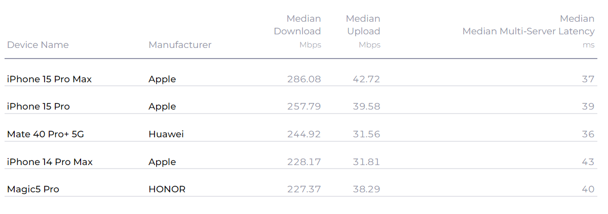 至于具体设备方面,三季度苹果的新品iPhone 15 Pro Max和iPhone 15 Pro分别以286.08Mbps和257.79Mbps位居前两名,华为Mate40 Pro+ 5G则位居第三,中位数下载速度为244.92Mbps。