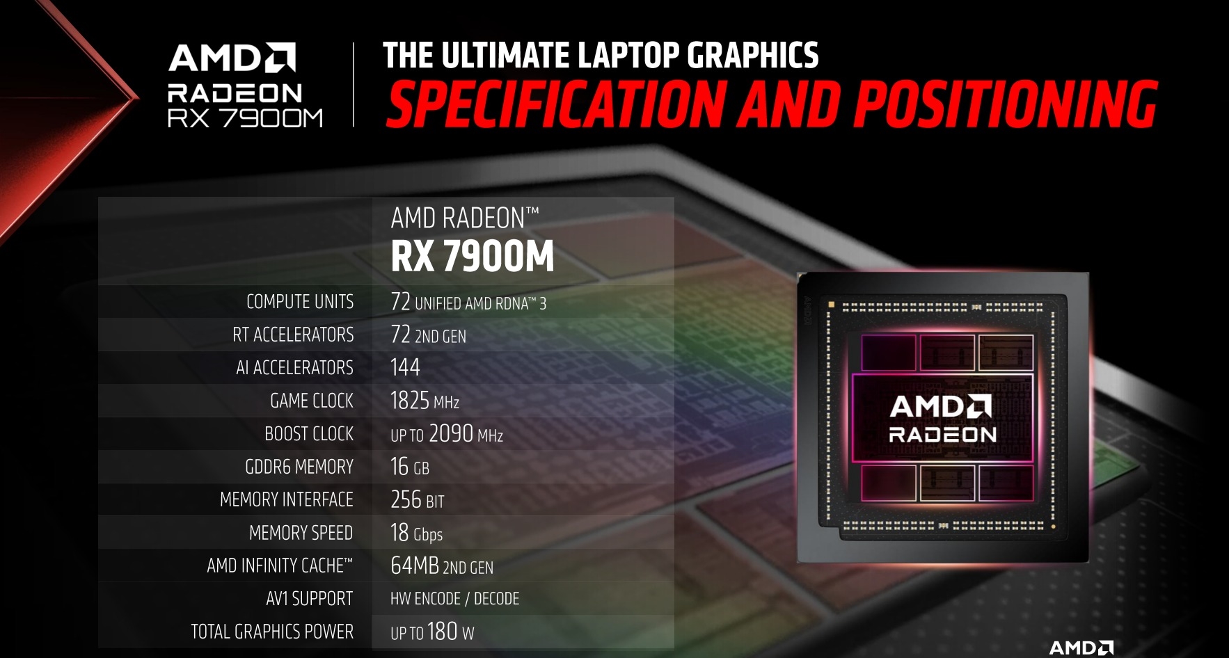 AMD突然发布了全新笔记本显卡RX 7900M,定位于旗舰游戏本,采用了大核心Navi 31。AMD此前发布的RX 7600M、7600S/7700S系列都是Navi 33小核心,最多2048个流处理器、8GB显存、15-120W功耗。