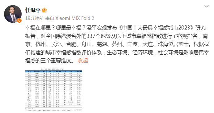 按照任泽平的说法,根据他们构建的城市幸福感指数评价体系,生态环境、经济环境、社会环境是影响居民幸福感的三个重要维度。