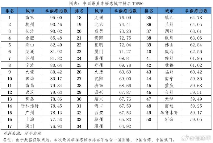 《中国十大最具幸福感城市2023》研究报告对全国除港澳台外的337个地级及以上城市幸福感指数进行了客观排名,南京位列第一。紧随其后的分别是:杭州、长沙、合肥、舟山、芜湖、苏州、宁波、大连、珠海位居前十。