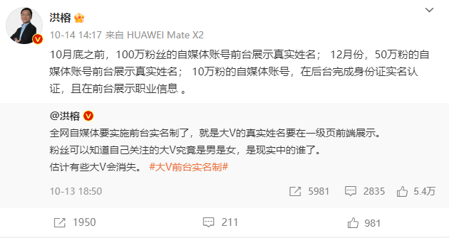 据了解,洪榕此前提到,10月底之前,100万粉丝的自媒体账号前台展示真实姓名。