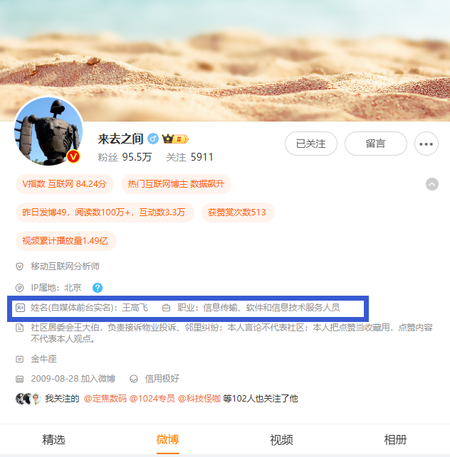 日前,微博财经大V洪榕称,超过一定粉丝数的微博大V将实行前台实名制。简单说,就是在账号主页展示其姓名、职业信息。目前,微博似乎已经开始测试前台实名制。今日在新浪微博CEO王高飞(微博昵称“来去之间”)的微博主页发现,其主页已经多了姓名和职业两个信息。