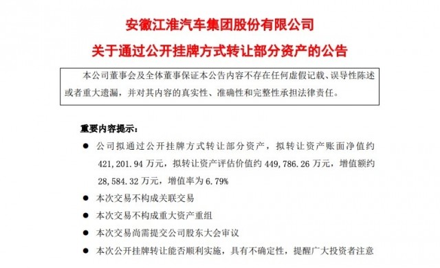 10月20日消息,江淮汽车昨日晚间发布公告称,公司拟通过公开挂牌方式转让部分资产,涉及乘用车公司三工厂存货、固定资产、在建工程、 房屋建筑物以及土地使用权及乘用车公司新桥工厂构筑物和设备资产,拟转让资产评估价值为44.98亿元。