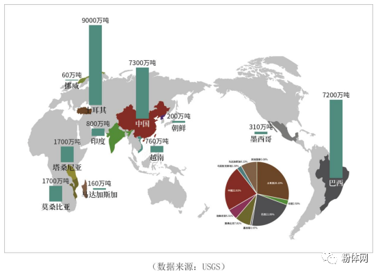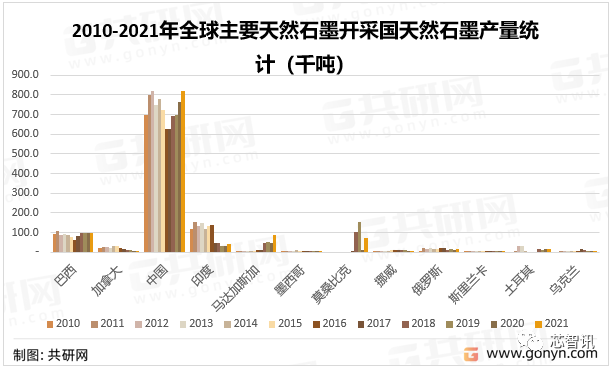 从全球石墨储量来看,据美国地质调查局(USGS)数据统计,截至2020年底,全球已探明天然石墨资源储量约为3.2亿吨,2020年全球石墨的总产量为110万吨。