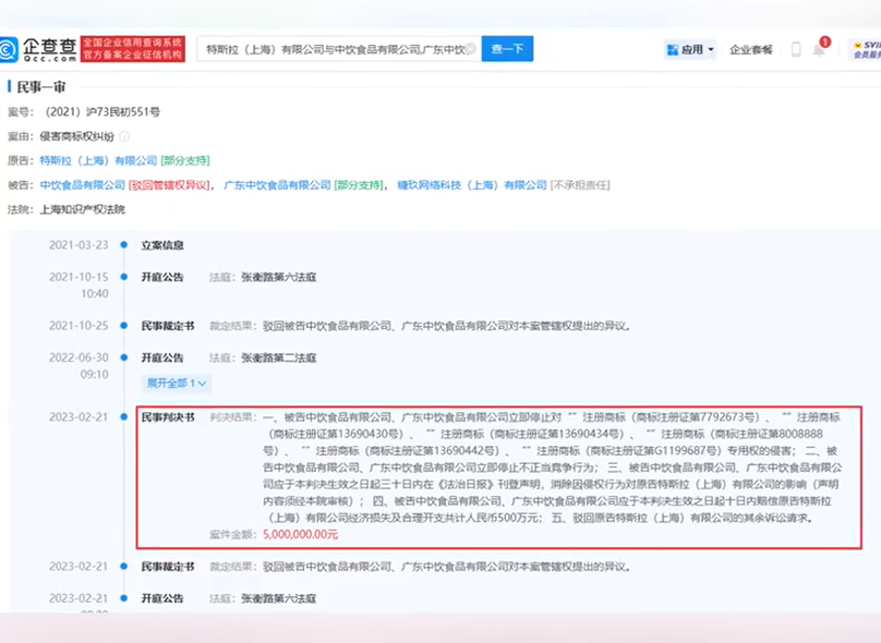 10月20日消息,这应该是特斯拉在国内第一次获赔500万的案子。据企查查APP显示,近日,中饮食品有限公司、广东中饮食品有限公司被强制执行500万元,所属司法案件为特斯拉(上海)有限公司与上述公司相关侵害商标权纠纷案件,执行法院为上海市第三中级人民法院。