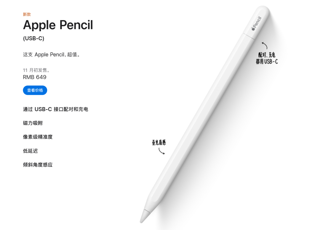 简单来说,这款外观和二代 Apple Pencil 酷似、底下括号里打着 “ USB-C ” 、售价 649 元的新款苹果笔,就是一款添加了 C 口的 “ Apple Pencil 青春版 ” 。