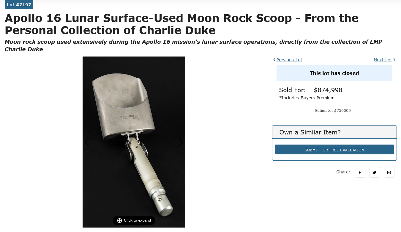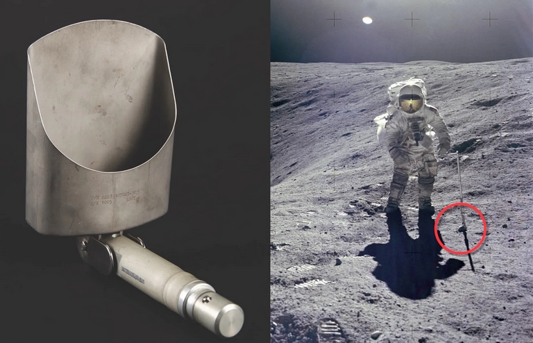 最近,一把上过月球的铲子被高价拍卖。这是随美国阿波罗 16 号载人飞船一起登陆月球,并用于回收月球表面土壤的铲子。它有着多个弹簧按钮,并且可以改变角度。在拍卖会上,它被以 874,998美元的价格售出。据报道,起可以连接的延长杆至今还在月球上。