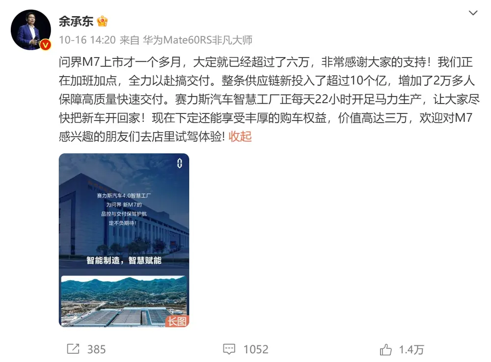 更“可怕”的是,这款车的订单继续以一个惊人的速度增长。在10月6日,也就是十一长假的末尾,问界对外传播的订单总数为“破5万个”。而在10月13日的品牌直播中,亲自到生产线上打螺丝的华为常务董事、终端BG CEO余承东透露,问界M7的订单已经破了6万个。