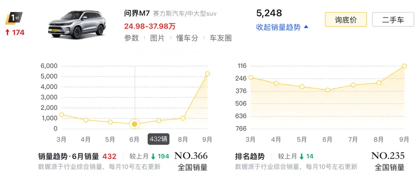 从盘桓于谷底到一飞冲天,余承东和问界汽车在过去半年的日子,过得相当戏剧化。在销量持续“半死不活”超过6个月后,问界M7随着新款大5座车型的发布迎来了起飞。在9月12日发布会后,当月交付量冲到了5248辆。
