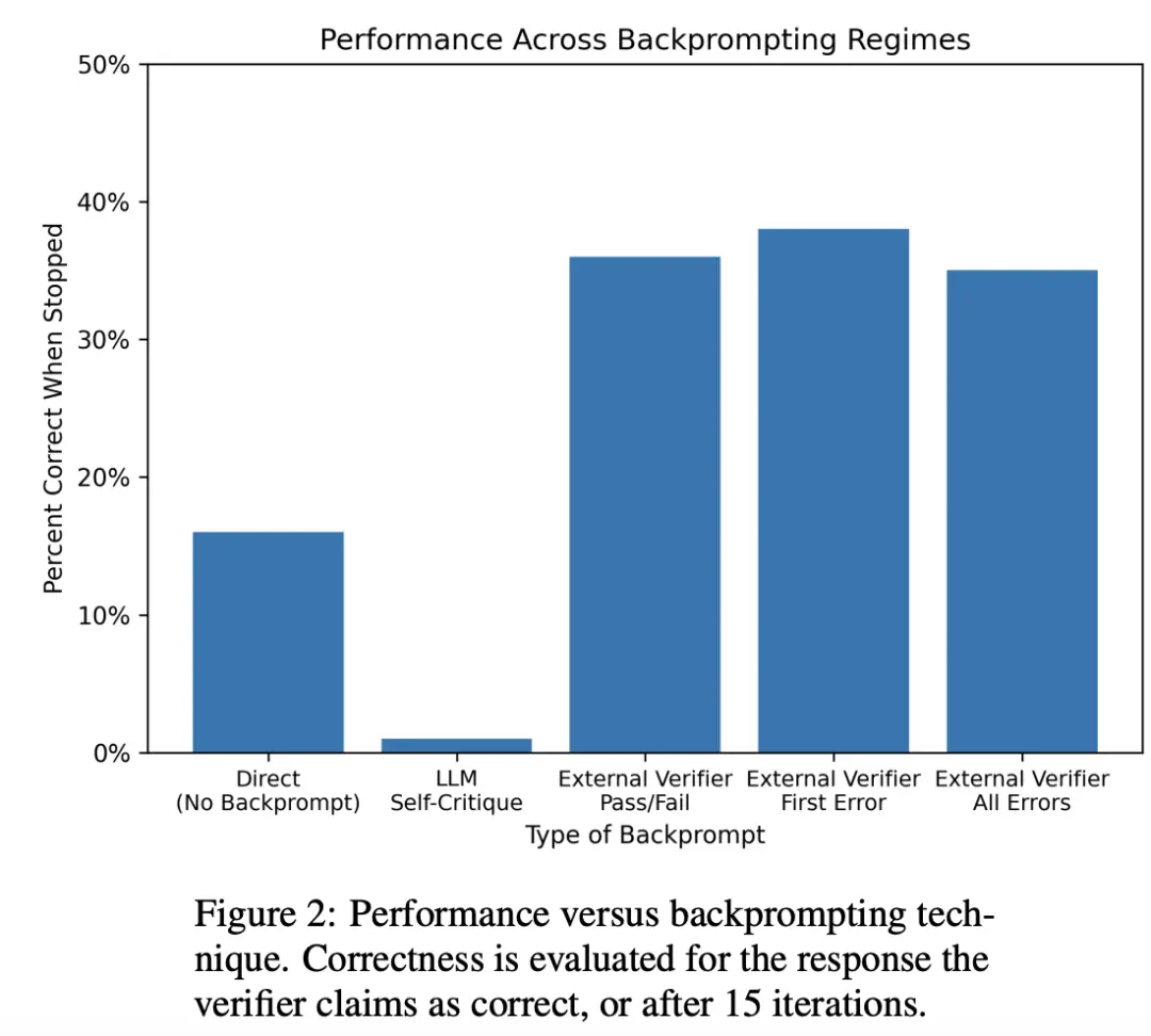 当研究人员运行相同的实例,但这次使用由相同的语言模型充当验证者生成的反馈进行返回提示时,性能急剧下降——100个实例中只有一个得到了正确的回答。
